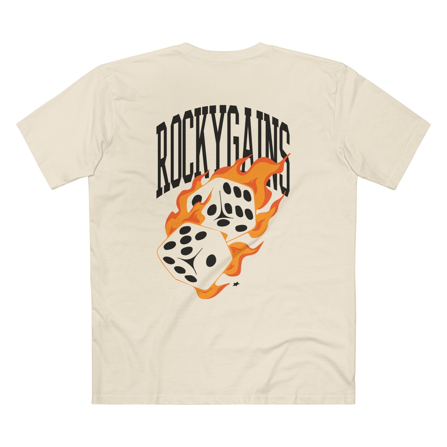 - DTG printing - RockyGains Mountain logo on front left chest, and RockyGains Conquer design on the back